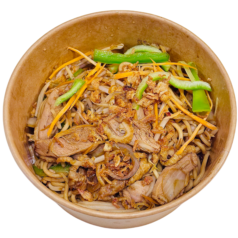 canard, soja, carotte, poivron, oignon, chou, oignons frits
