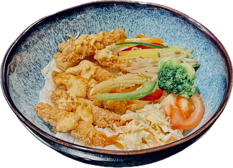 tempuras de crevettes, sauce andalouse, carotte, mini maïs, soja, poivron, salade de chou, brocoli, radis mariné