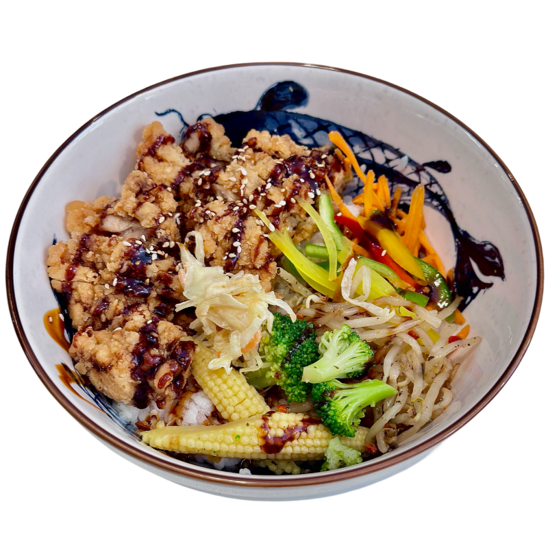 poulet croustillant, sauce maison, carotte, soja, poivron, salade de chou, brocoli, radis mariné, sésame